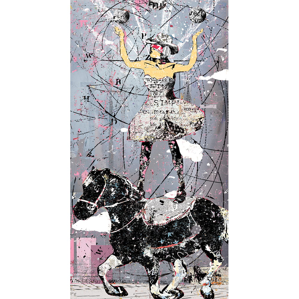 Juggler on Horseback. While this original is sold, I am offering prints on metal, hand varnished with a solid wood black floater frame.